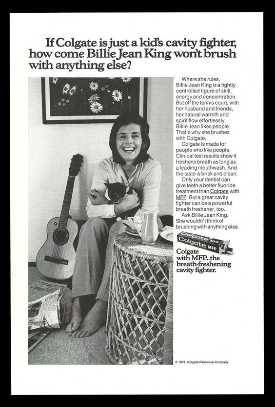 33. Billie Jean King won’t use anything Colgate, she announced in the ’70s. She appears oddly with a guitar instead of a tennis racquet.