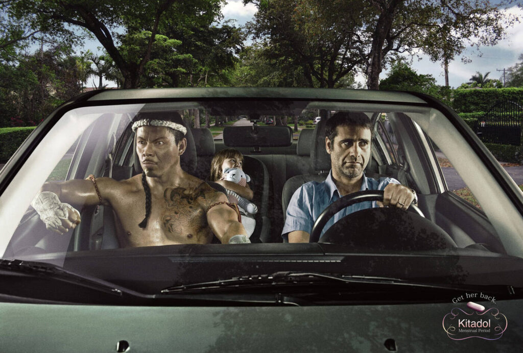 In the first ad, the woman was replaced with an irritated Thai boxer and portrayed him co-passenger in a traditionally masculine setting, represents someone experiencing the physical or emotional effects of their period. She exhibits nonverbal behavior that we would normally recognize as the interaction between a tense couple. The man looks nervous, and boxer aka woman is staring sourly/angrily outside.